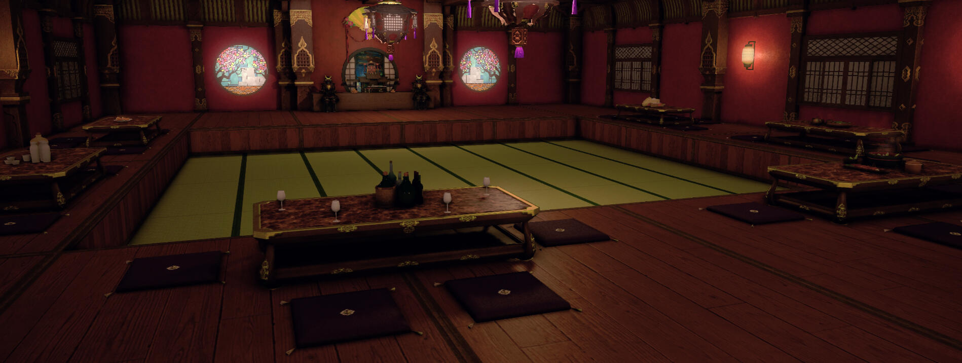 Be seated in one of our establishment's fine dining or entertaining areas. Meet new friends and experience personalized entertainment no matter where you sit.We offer four main entertainment options depending on the day and availability. The Teahouse, Sushi Bar, Onsen, and Fight Ring are all housed within one building for your pleasure.The Teahouse - Located on the bottom floor, the Teahouse offers a selection of food and drink for your pleasure. You will never be alone as we practice communal seating. You'll always be seated with your own group, but also with strangers unless you request otherwise. Our flowers will also seat themselves among the tables to serve and offer banter.To the left of reception, there are two private tea rooms. These can be used by groups for a more private dining experience or as a place for a less public conversation, should you desire.The Sushi Bar - Up the stairs and to the right is the Sushi Bar, a small dining area for a great lunch or to listen in on the latest rumors. Maybe you're here to pick up a job, maybe just a quick bite to eat. Either way, you're well cared for by attentive staff.The Onsen - Up the stairs to the left are a mirrored pair of onsen. Segregated by gender/sex, these two rooms are fully separated and private. A flower can accompany you for a massage or company, or you can bathe alone. These spaces are always available, though staff may not be. (Our non-binary and transgender guests are welcome to choose as they feel comfortable. Our wording is only to reflect a separation, not a political stand.)The Fight Pit - Downstairs to the left is the Fight Pit and bar area. About once a moon, this area will open up for special events or to showcase affiliate battles. Refreshments are available as well as company, much like the rest of the house.